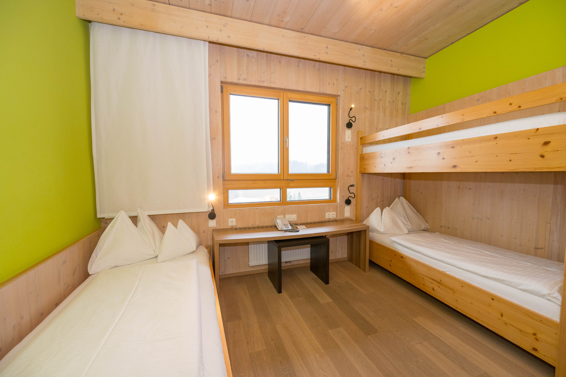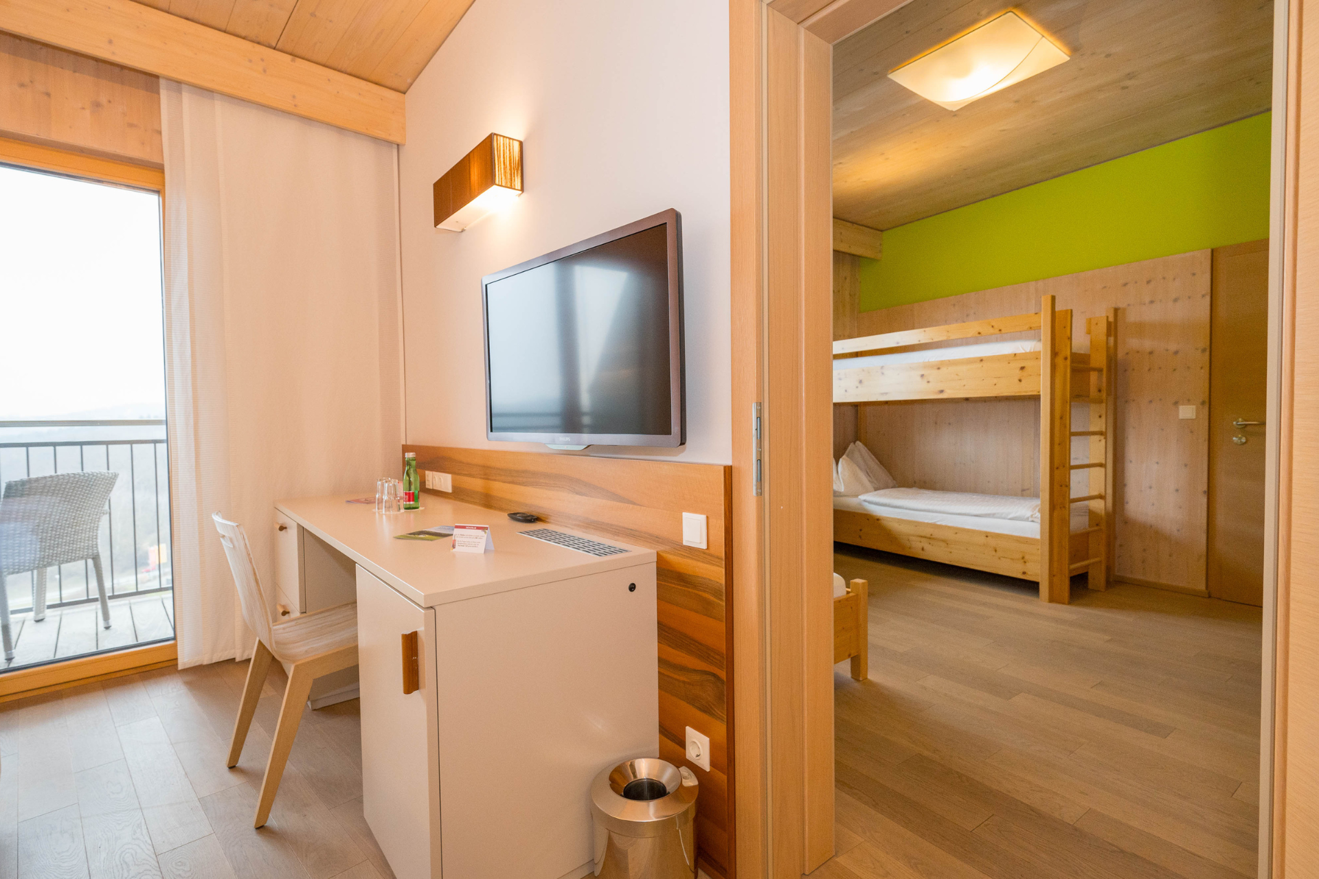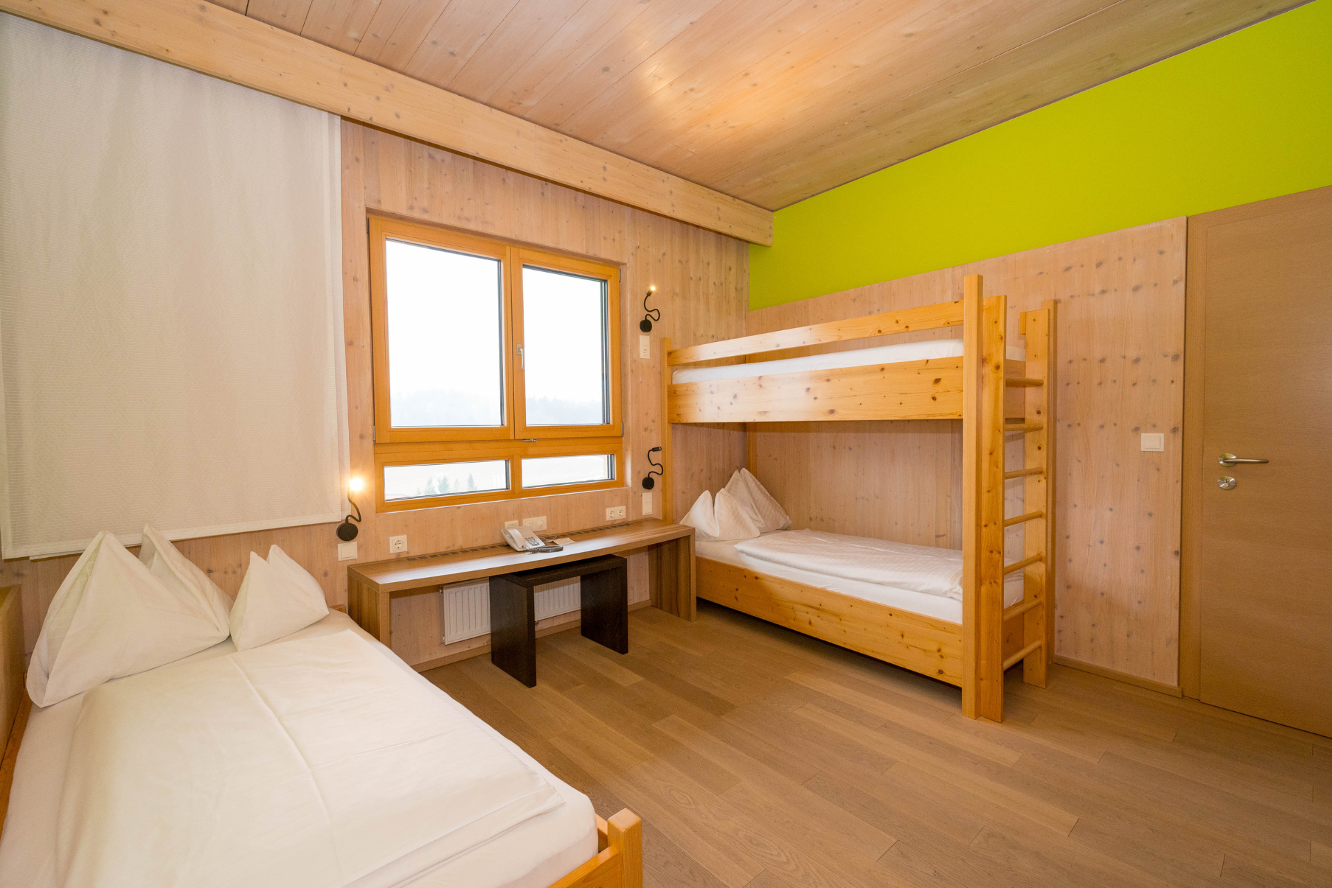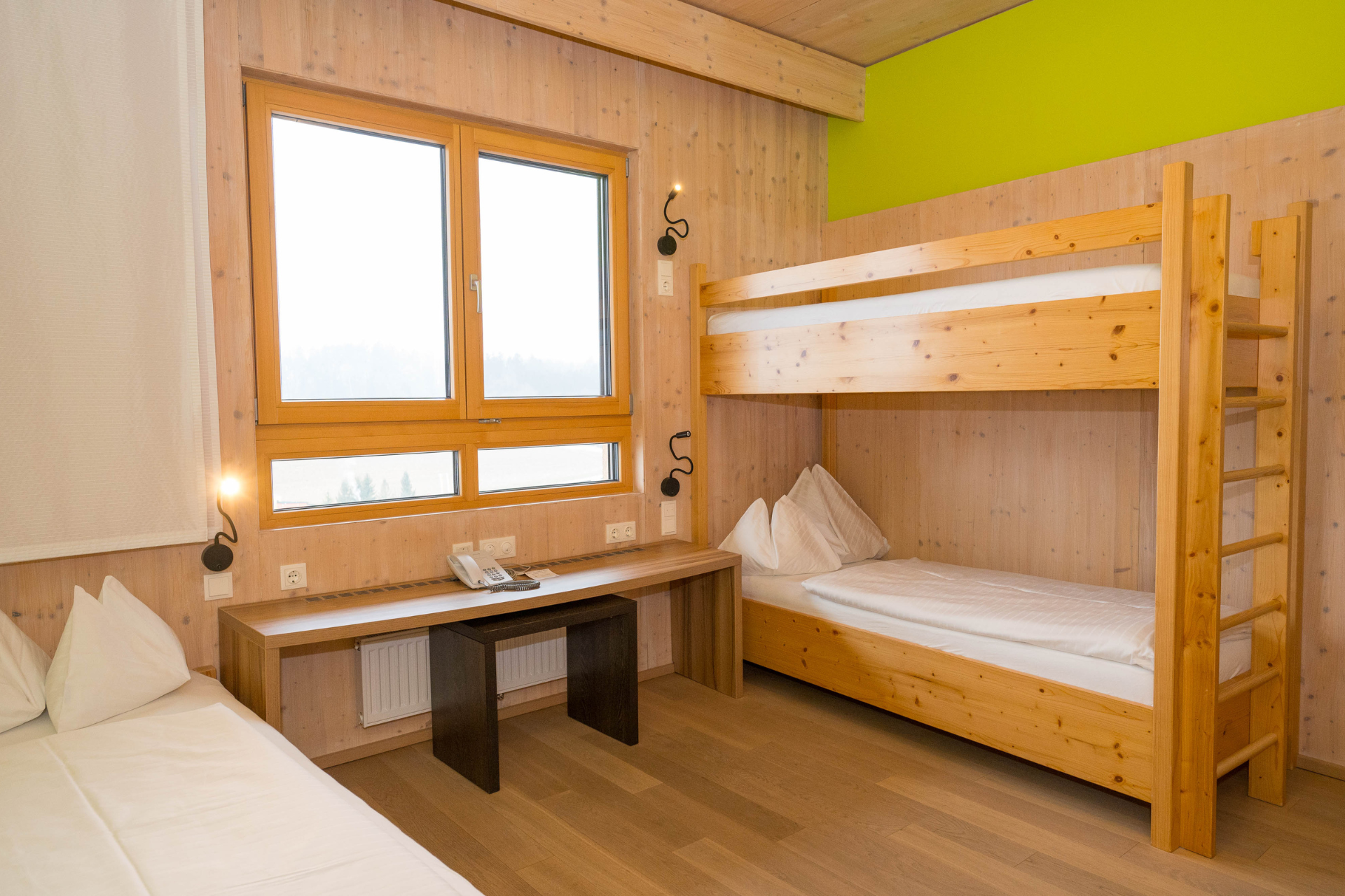 32 m² natürlich, hell, freundlich, funktionell durchdacht und behaglich gestaltet. Die aus heimischem Fichtenholz errichteten Zimmer verfügen über ein ausziehbares Schlafsofa und Balkon sowie ein 15 m² großes Kinderzimmer.