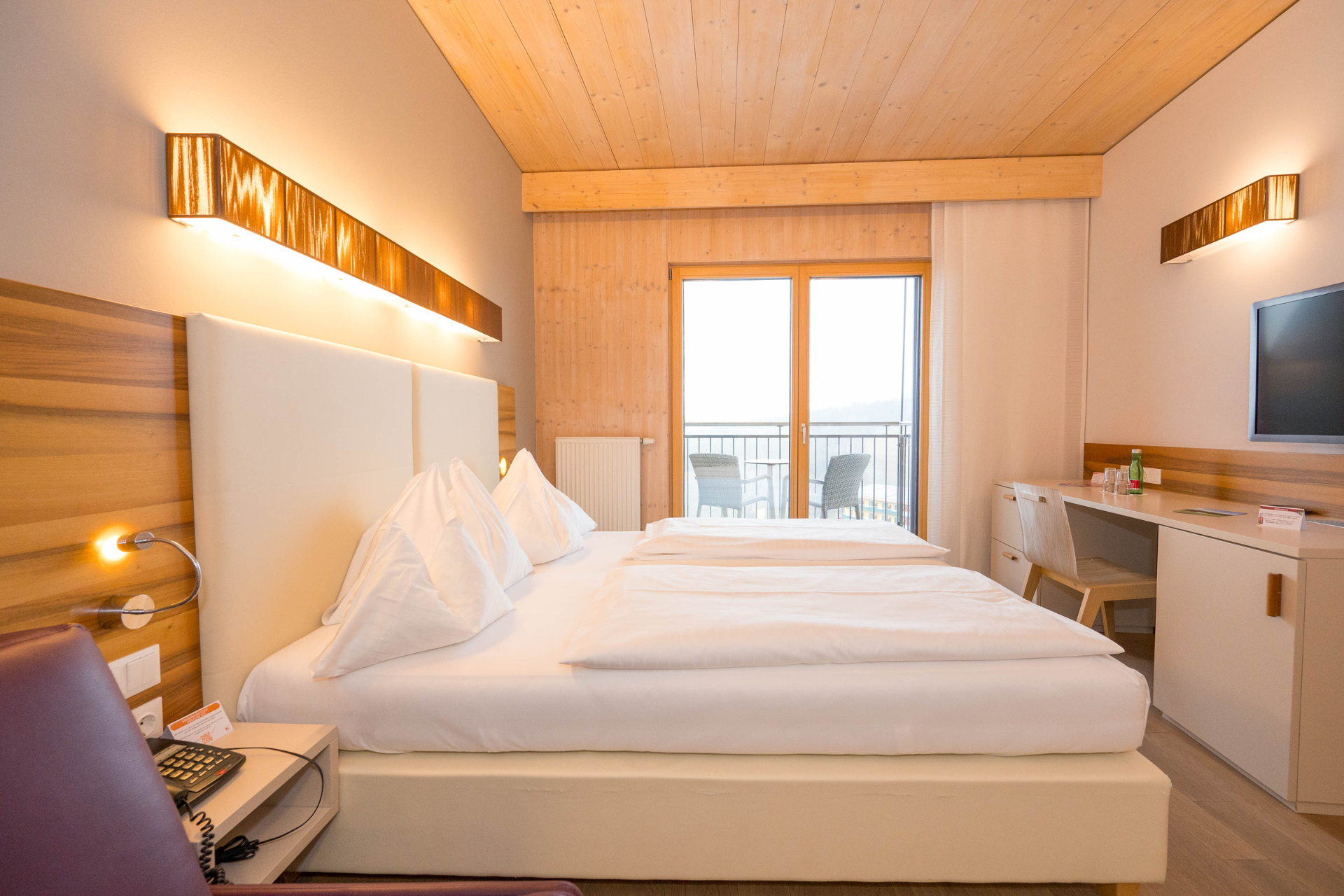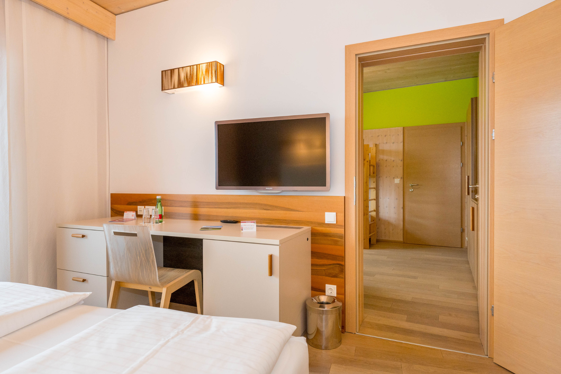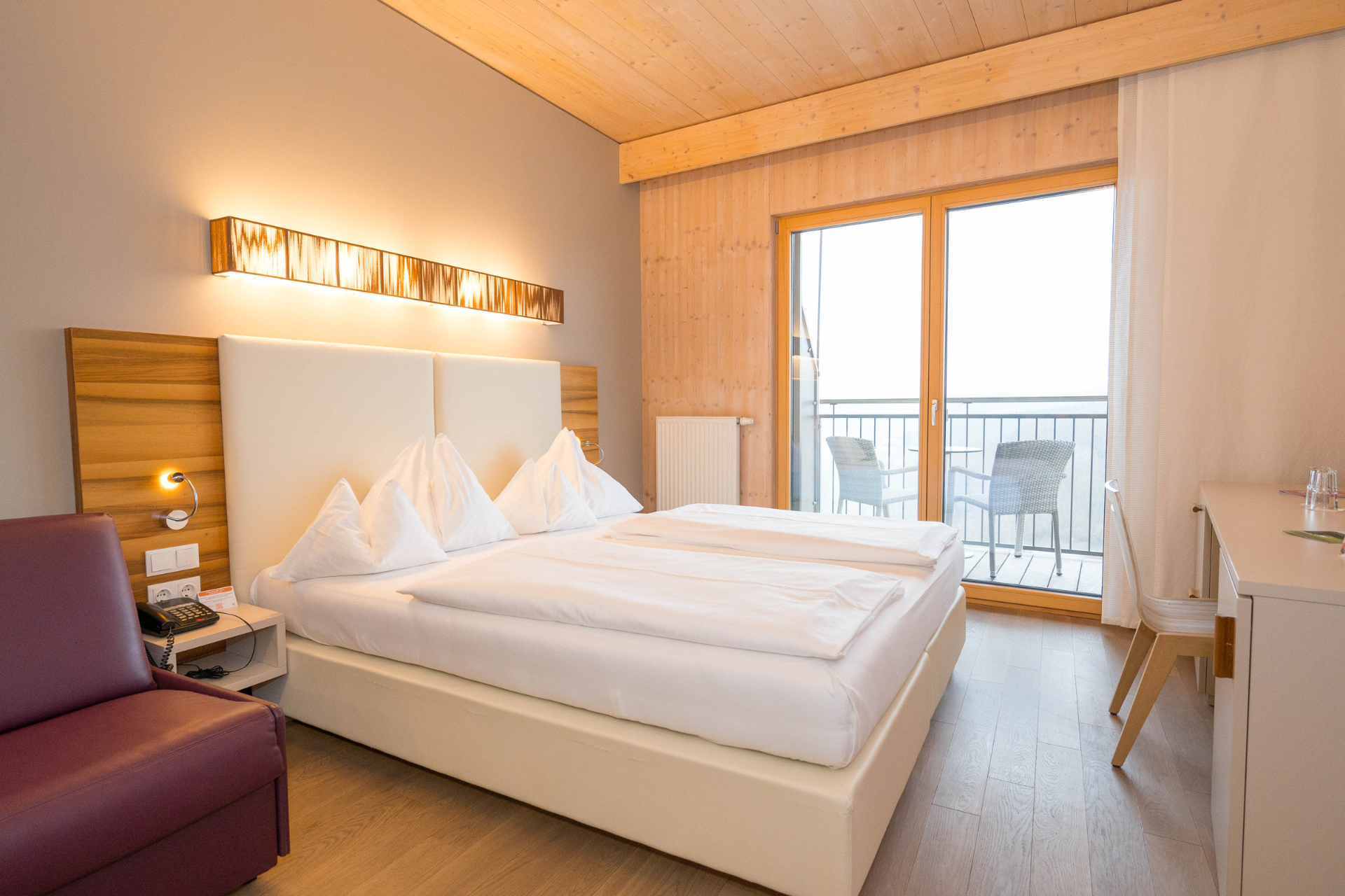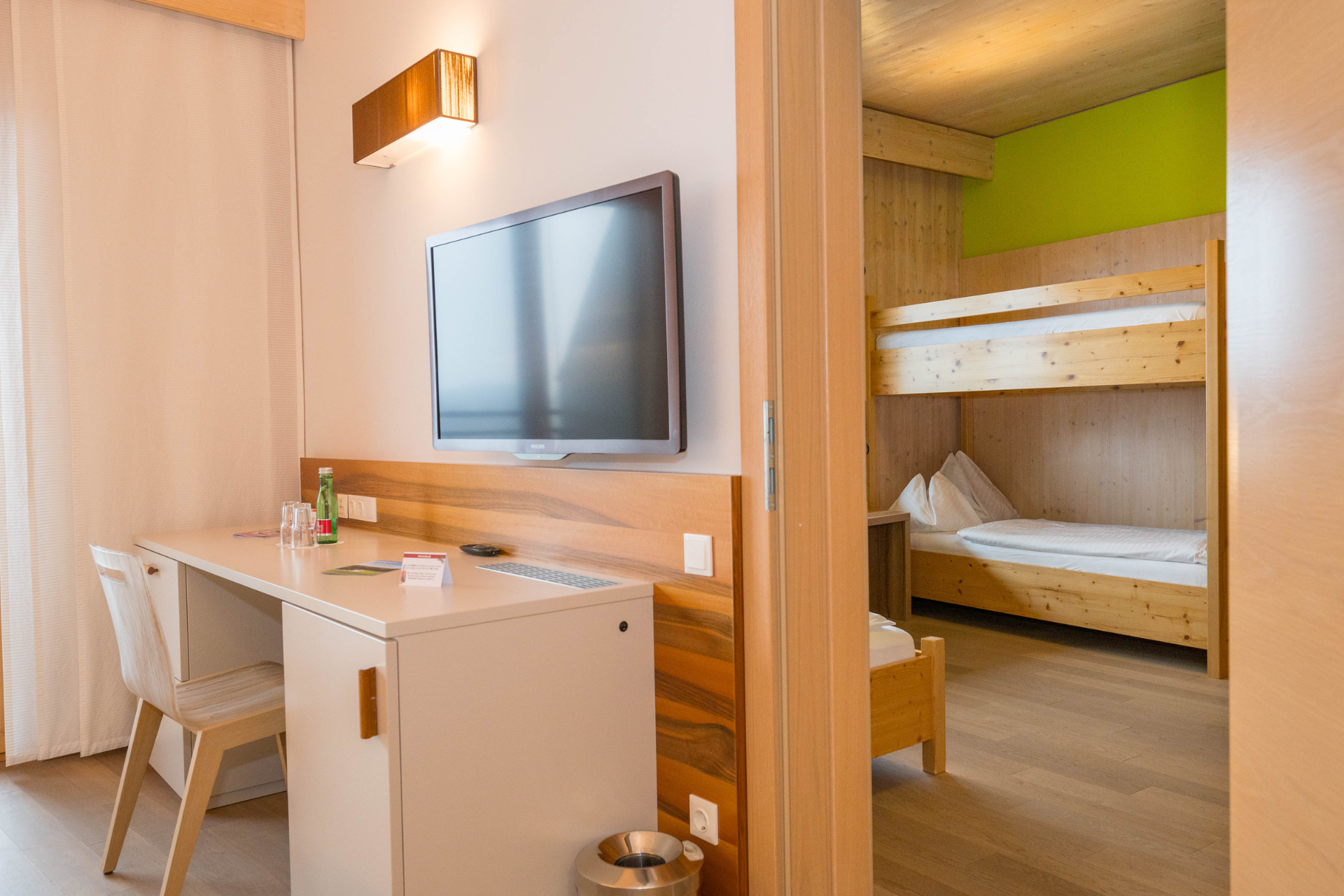 32 m² natürlich, hell, freundlich, funktionell durchdacht und behaglich gestaltet. Die aus heimischem Fichtenholz errichteten Zimmer verfügen über ein ausziehbares Schlafsofa und Balkon sowie ein 15 m² großes Kinderzimmer.