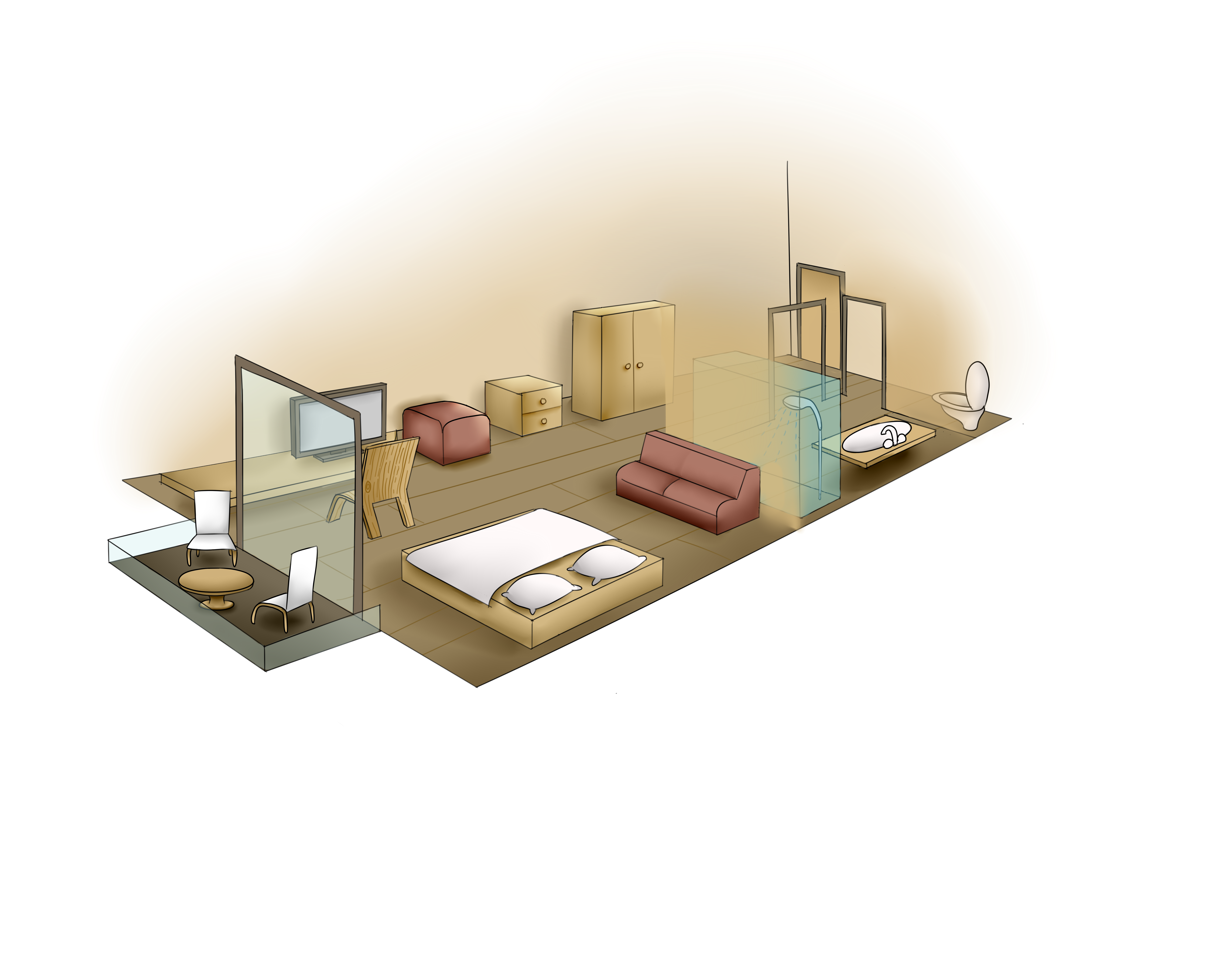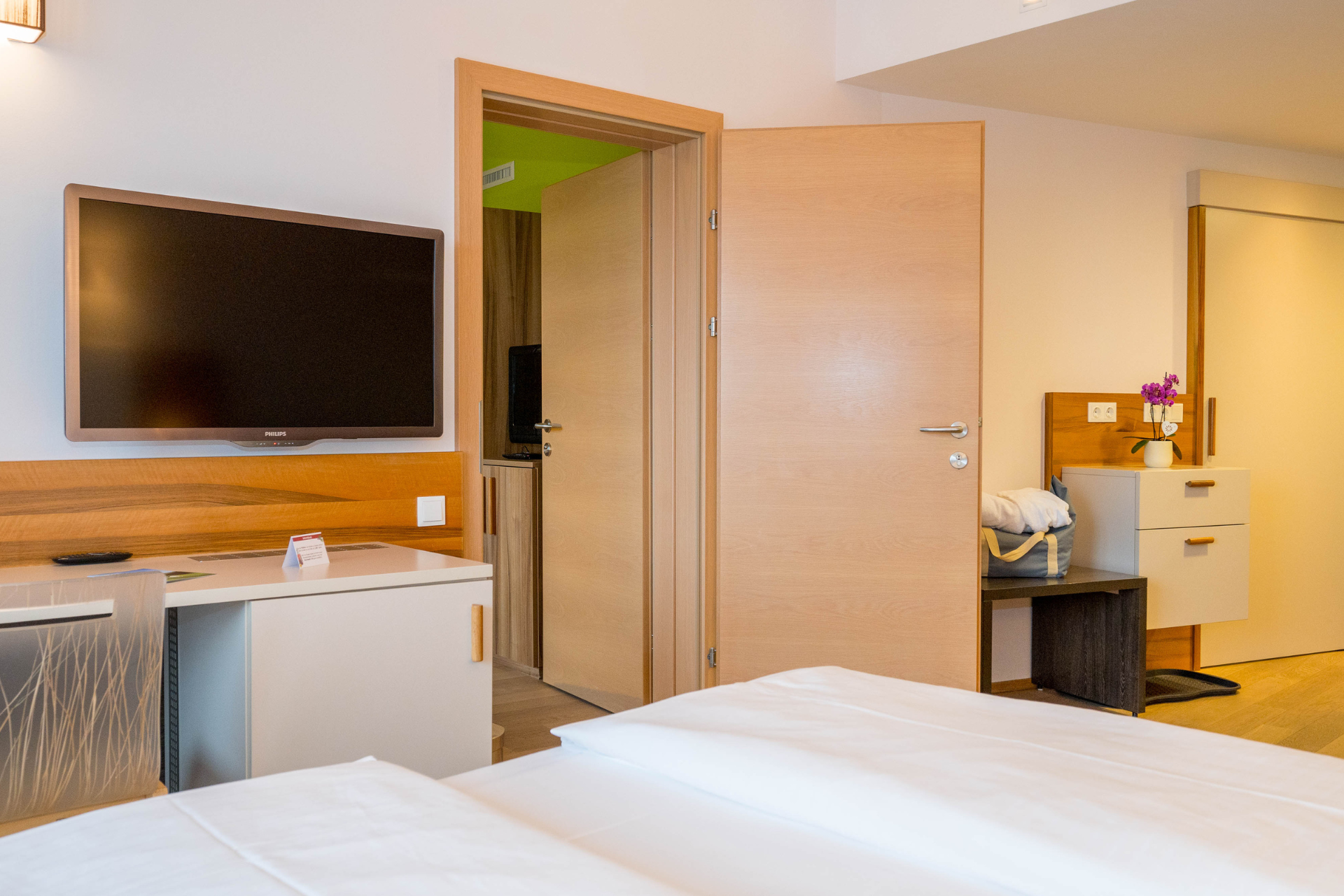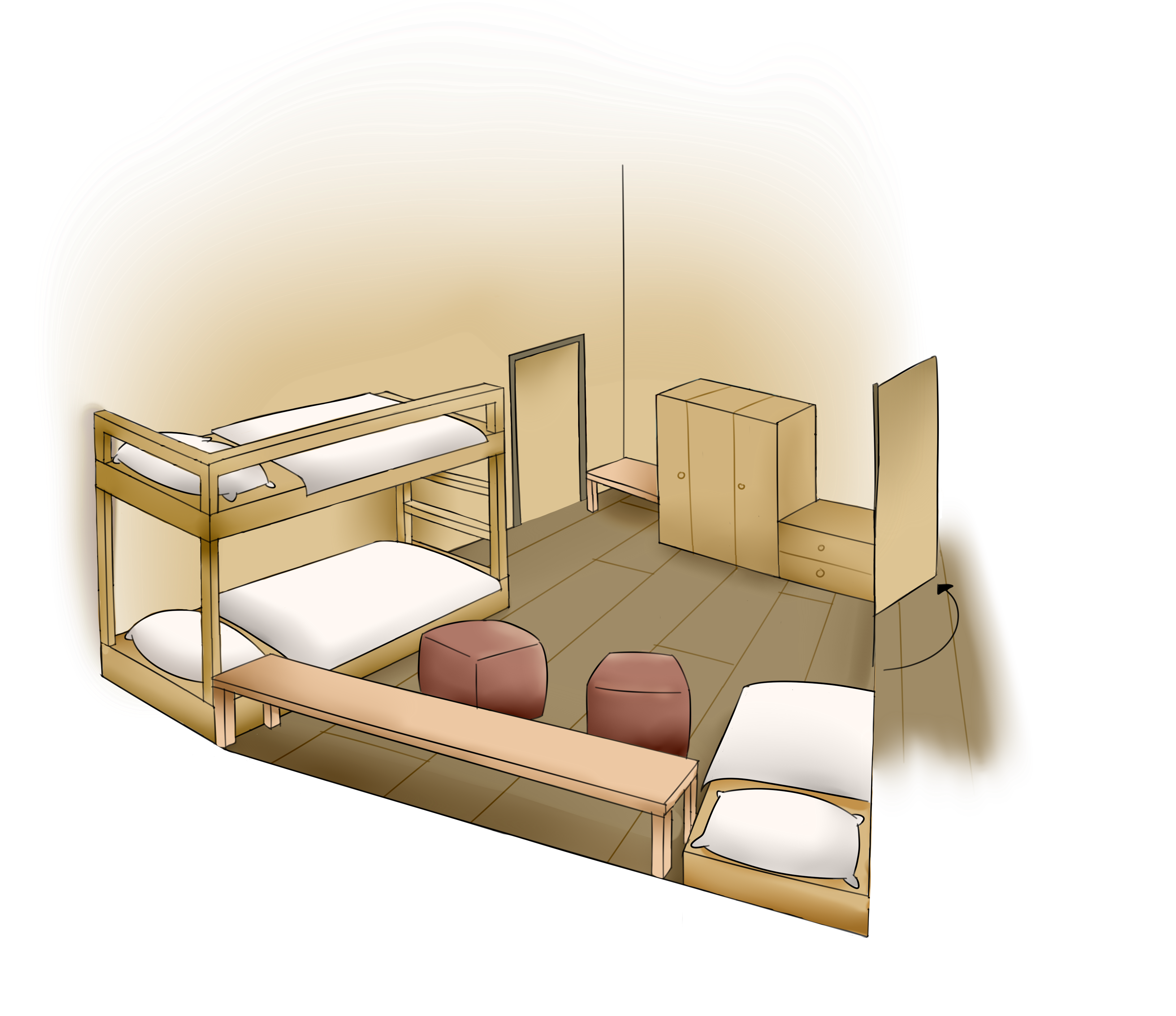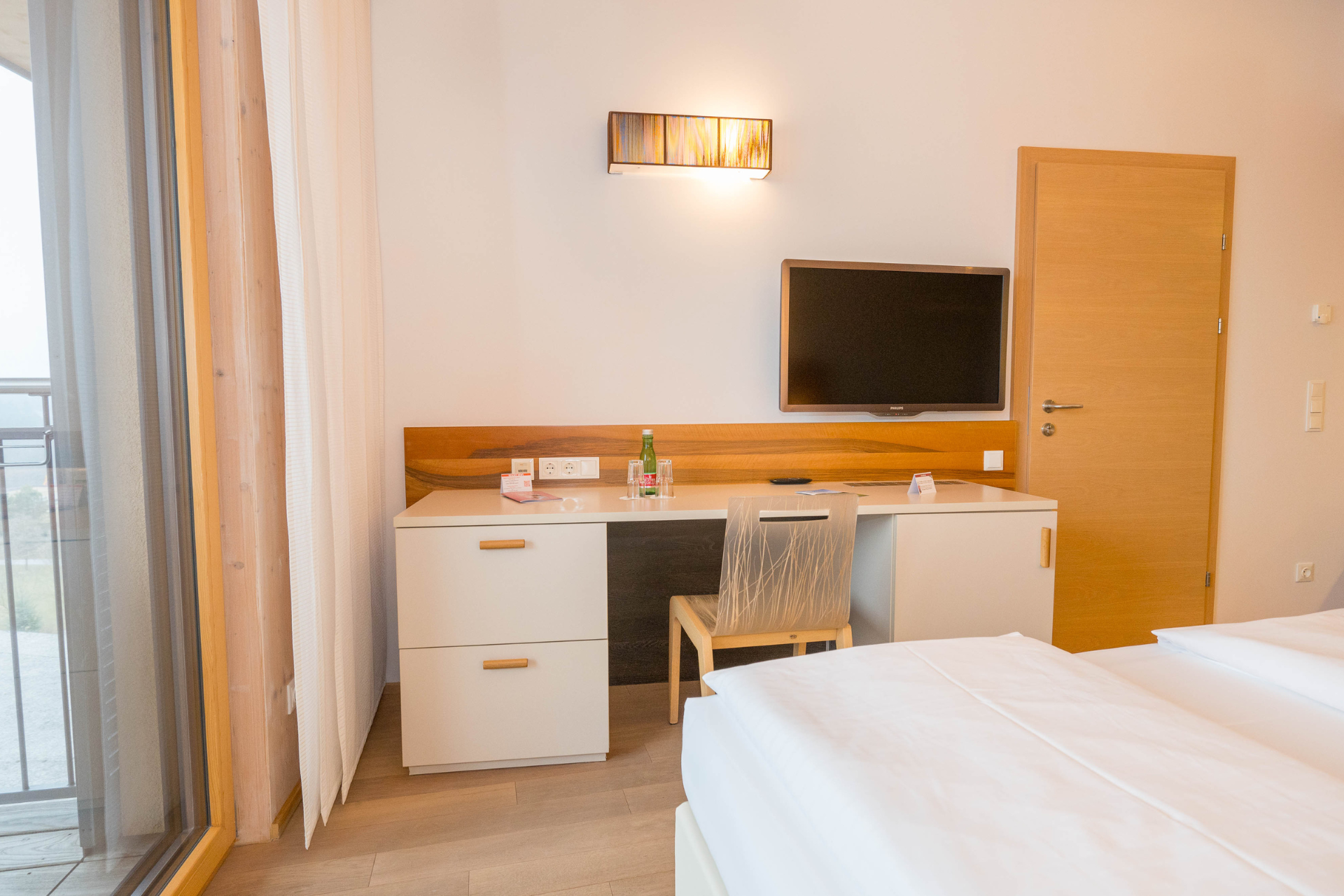 32 m² natürlich, hell, freundlich, funktionell durchdacht und behaglich gestaltet. Die aus heimischem Fichtenholz errichteten Zimmer verfügen über ein ausziehbares Schlafsofa und Balkon sowie ein 15 m² großes Kinderzimmer.