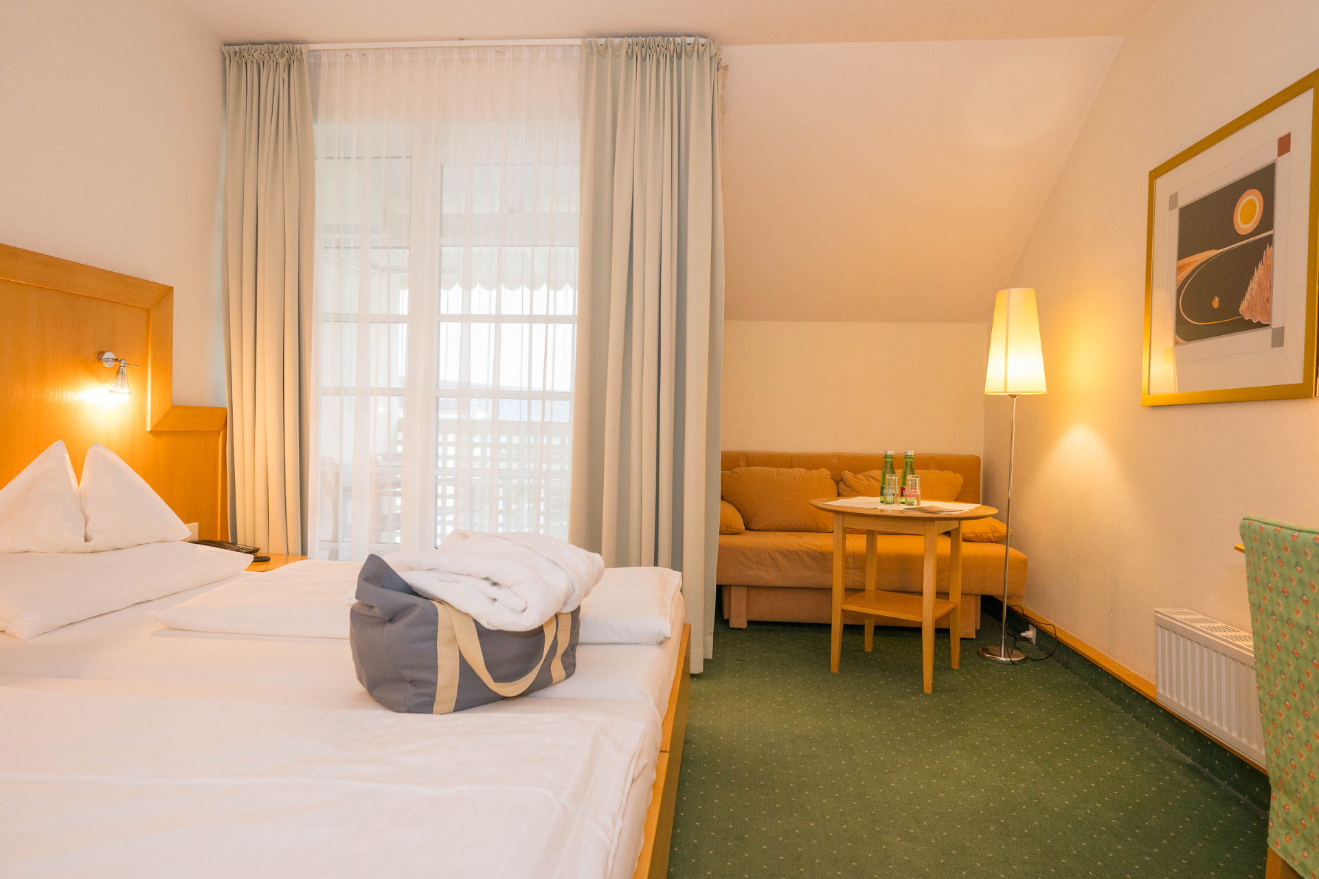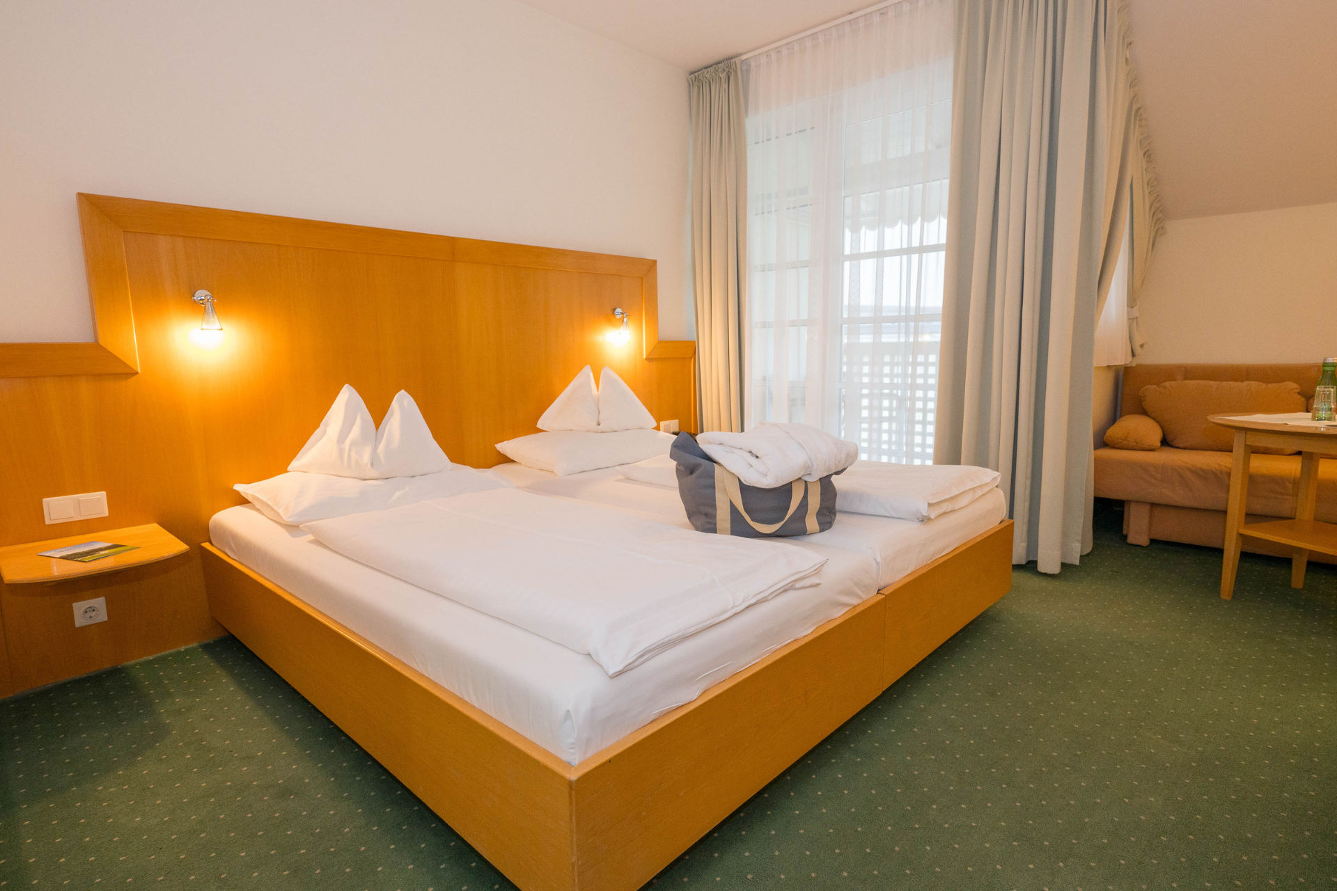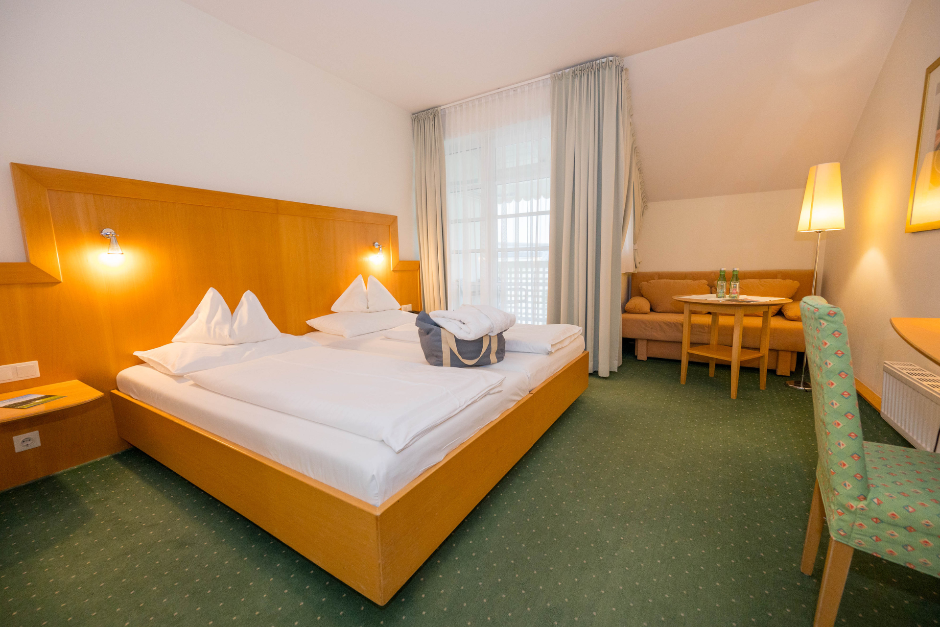 Heimelig eingerichtete Doppelzimmer für Familien mit ca. 25 m², lieblich und gemütlich gestaltet in freundlichen Gelb- und Grüntönen. Mit ausziehbarem Schlafsofa.