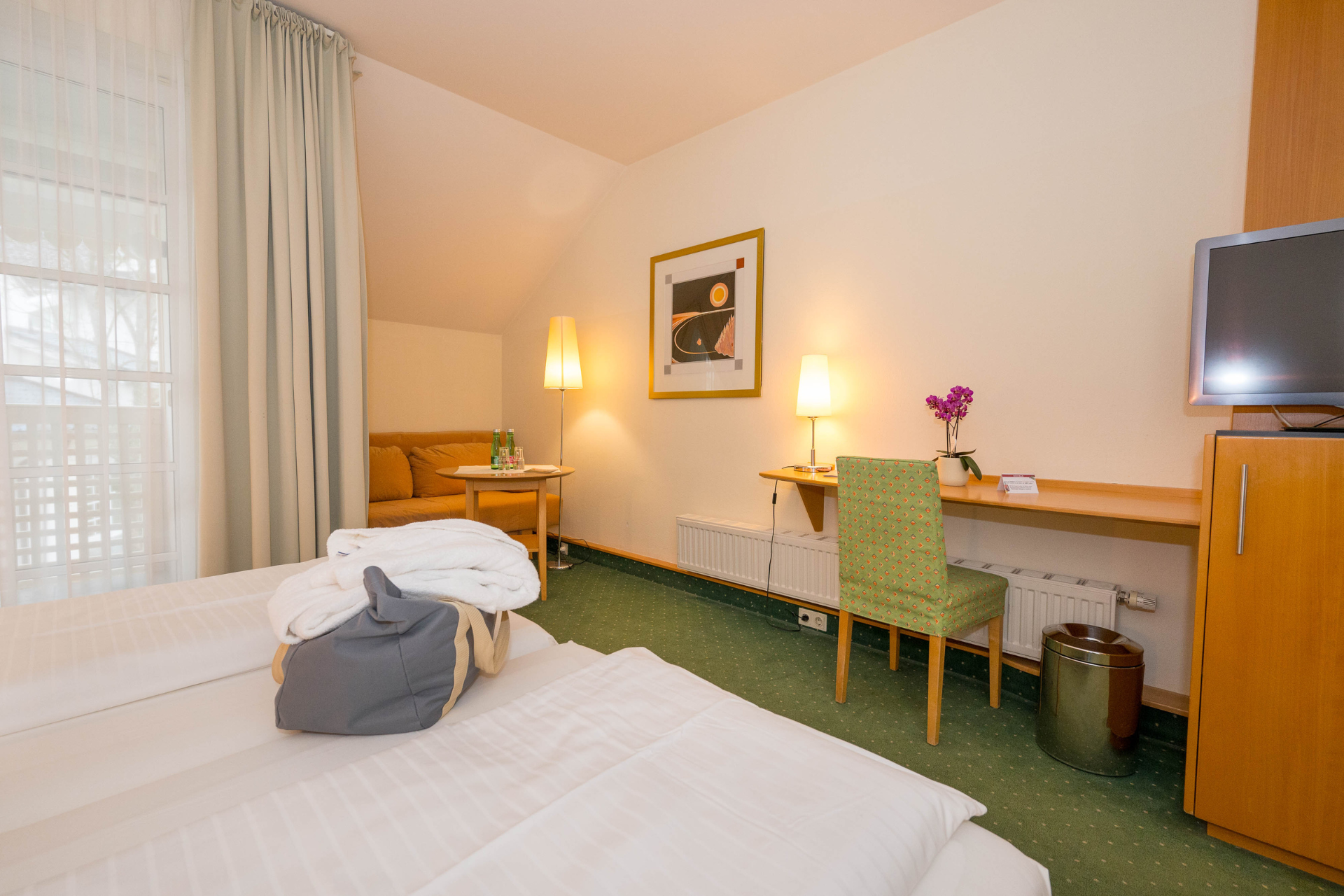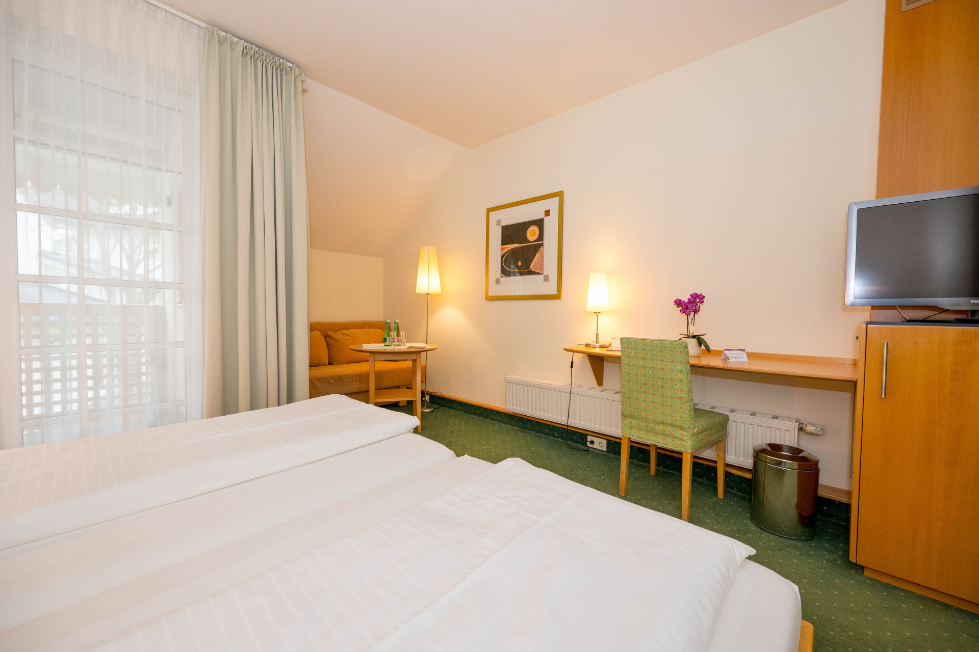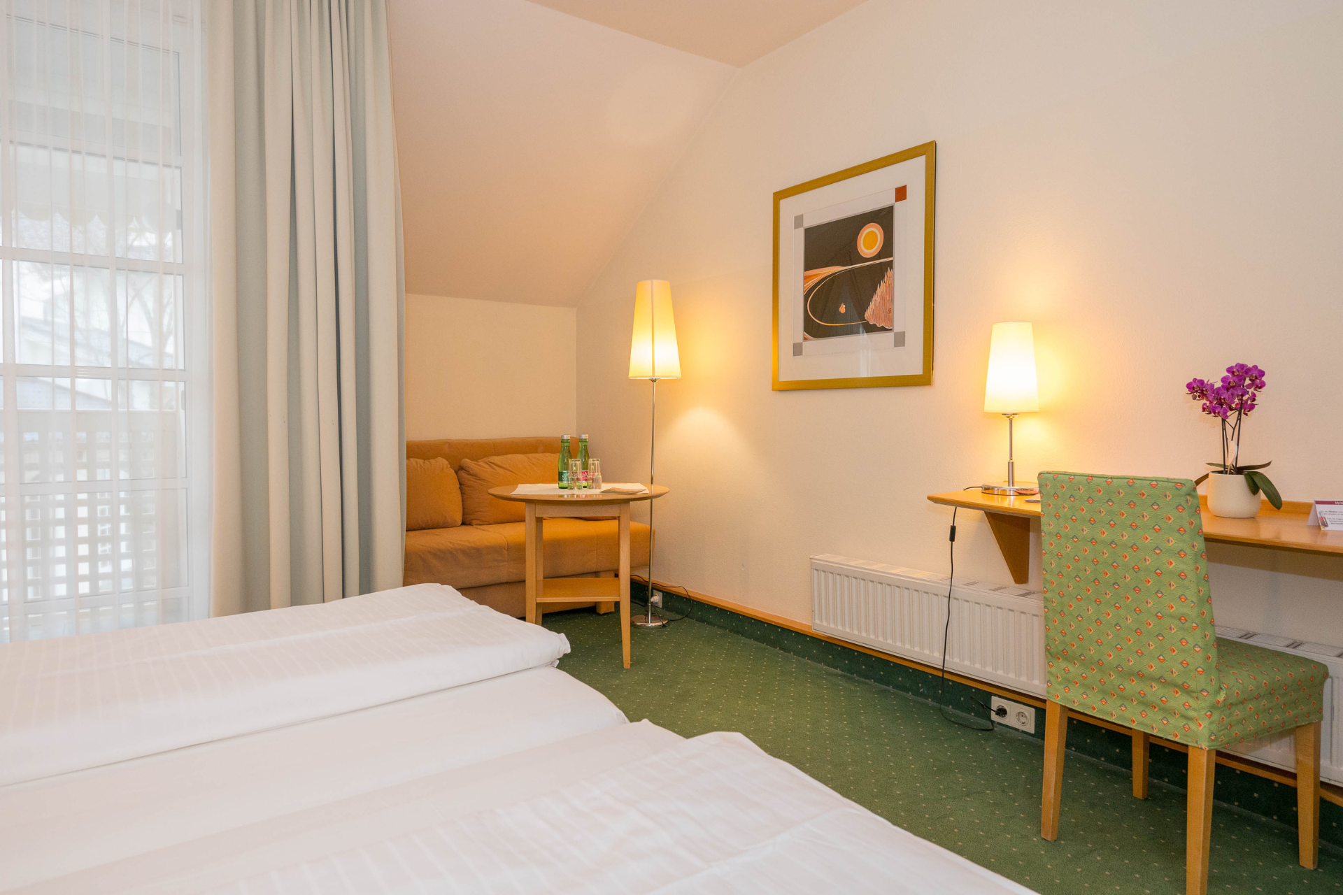 Heimelig eingerichtete Doppelzimmer für Familien mit ca. 25 m², lieblich und gemütlich gestaltet in freundlichen Gelb- und Grüntönen. Mit ausziehbarem Schlafsofa.