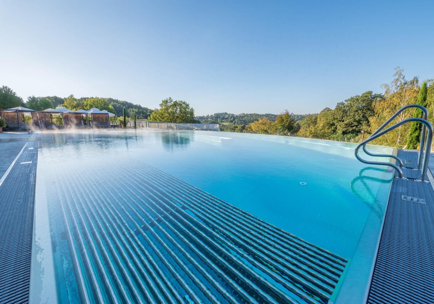 Freut euch auf ein Wassererlebnis unter freiem Himmel – mit herrlichem Blick über die sanften Hügel der Umgebung.